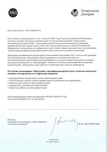 In the face of rapid technological changes and increasing demands for business digitalization, your Board of Directors can greatly benefit from engaging an independent expert capable of developing strategic solutions, effectively implementing digital transformation projects, and strengthening the company's competitive position. I, Dmitry Viktorovich Pshichenko, offer my competencies and experience in digital transformation and IT management for your company.